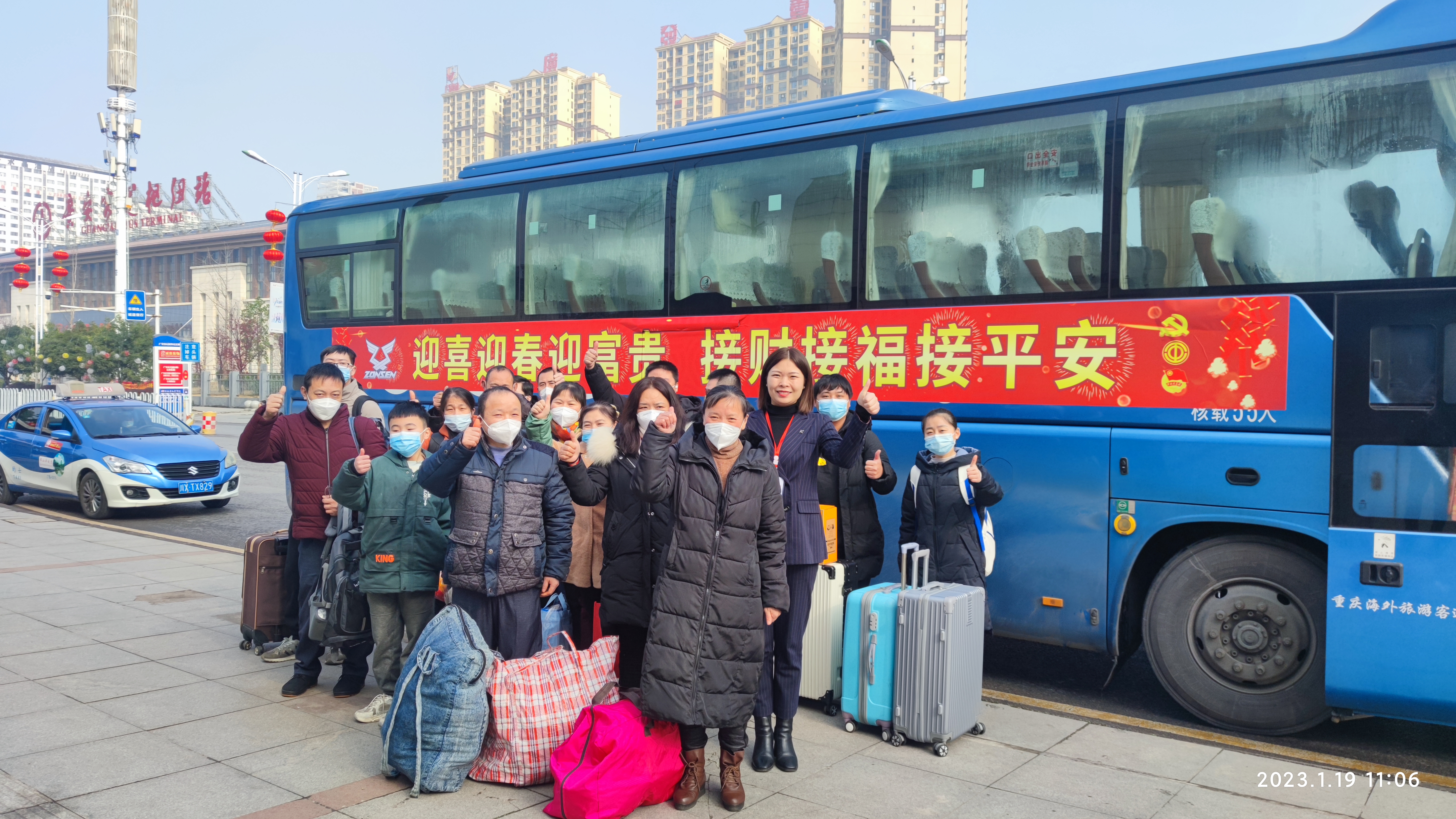 返鄉(xiāng)的員工們提著大包小包,相繼趕到了發(fā)車現(xiàn)場。公司工作人員高高舉起線路牌,線路牌上用紅色大字寫著綦江、南川、萬盛等目的地。上車現(xiàn)場,員工們笑語不斷,相互祝福,隊伍井然有序。一名接受采訪的員工說道,“太開心了,感謝公司關懷我們廣大員工,正是因為你們的辛勤付出,才讓我們回家的路更加溫暖,今年是我們一家人第二次坐上免費大巴回家。”看到電視臺記者在采訪,眾多乘車回家的員工高興地豎起大拇指。一個個動作,一張張笑臉,感恩的心在驛動。